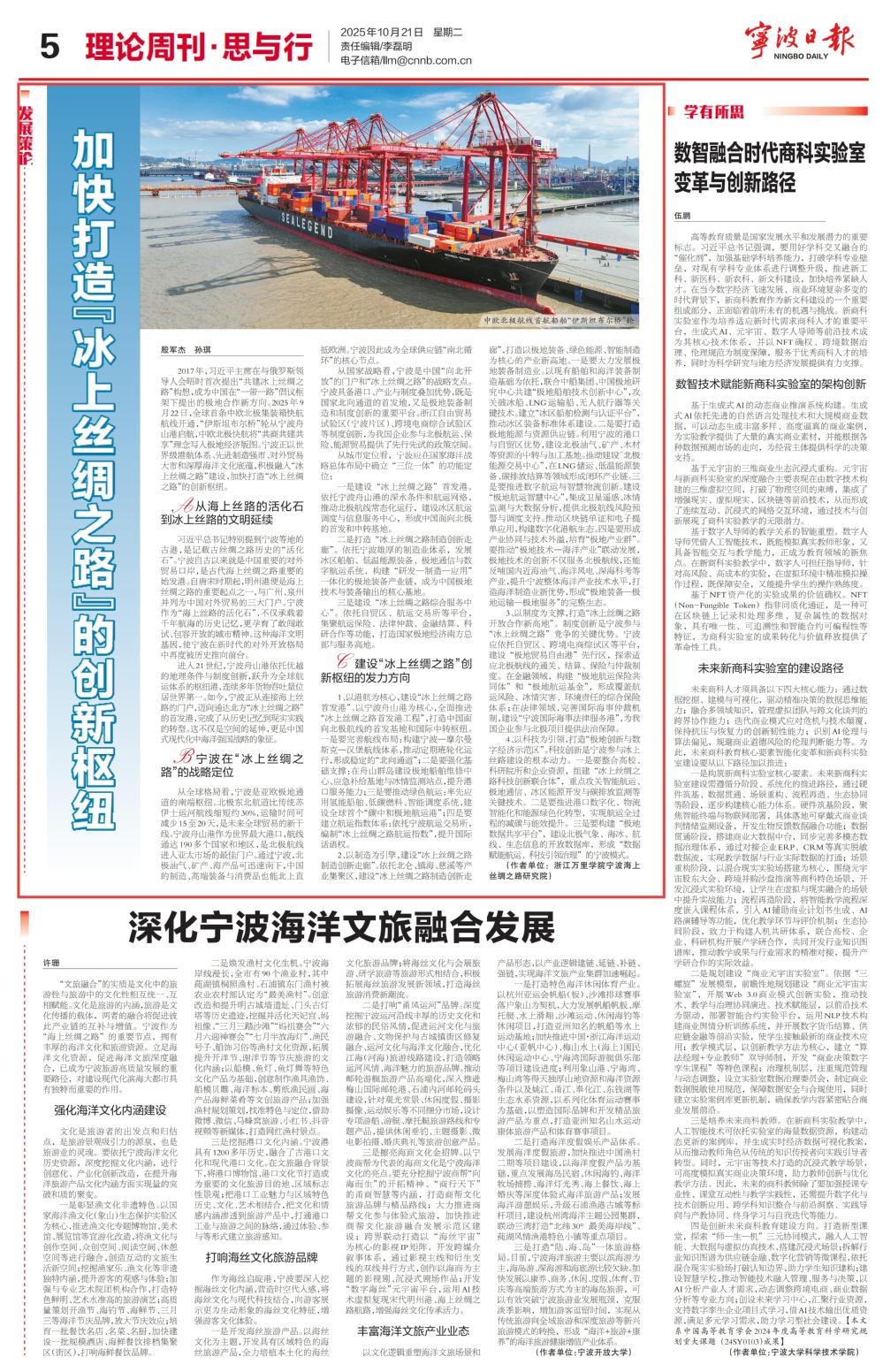 2025年10月21日,宁波海上丝绸之路研究院殷军杰副研究员的《加快打造“冰上丝绸之路”的创新枢纽》文章被《宁波日报》理论周刊版刊登。该文深入探讨了宁波依托港口、产业和制度优势打造“冰上丝绸之路”创新枢纽的路径与举措,为我市融入国家北极战略、建设全球海洋中心城市提供了有力支持。