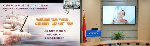 会议伊始,聚焦北极航道现实与前景的探讨。中国首位穿越北冰洋的女航海家、上海海事大学白响恩教授结合亲身经历,指出北极航行是争夺国际规则话语权的重要过程,并强调了航线的高风险与专业化特性。随后,俄罗斯圣彼得堡国立大学的皮萨连科教授通过视频,以近期从宁波出发的首条中欧北极集装箱快线为例,指出北极航线已从“试验可能”走向“可复制路径”,但地缘政治与基础设施风险依然存在。