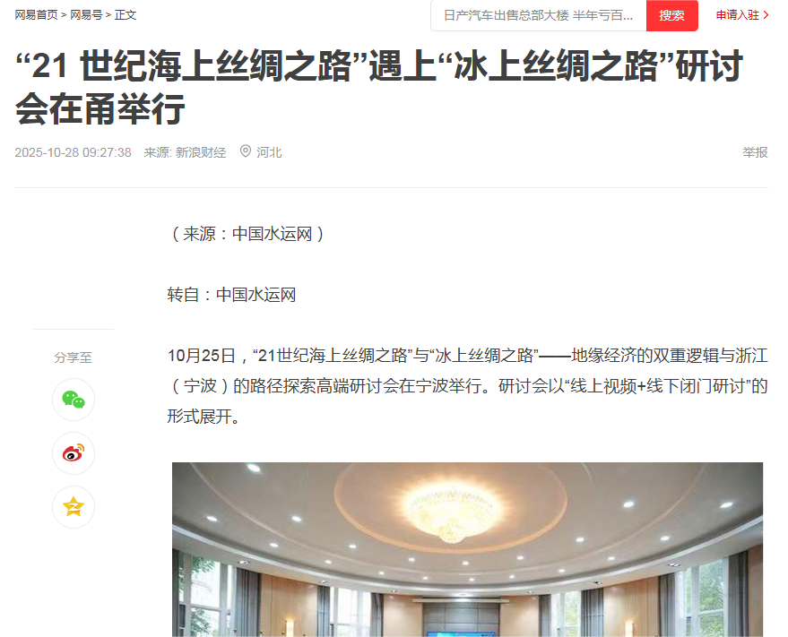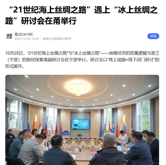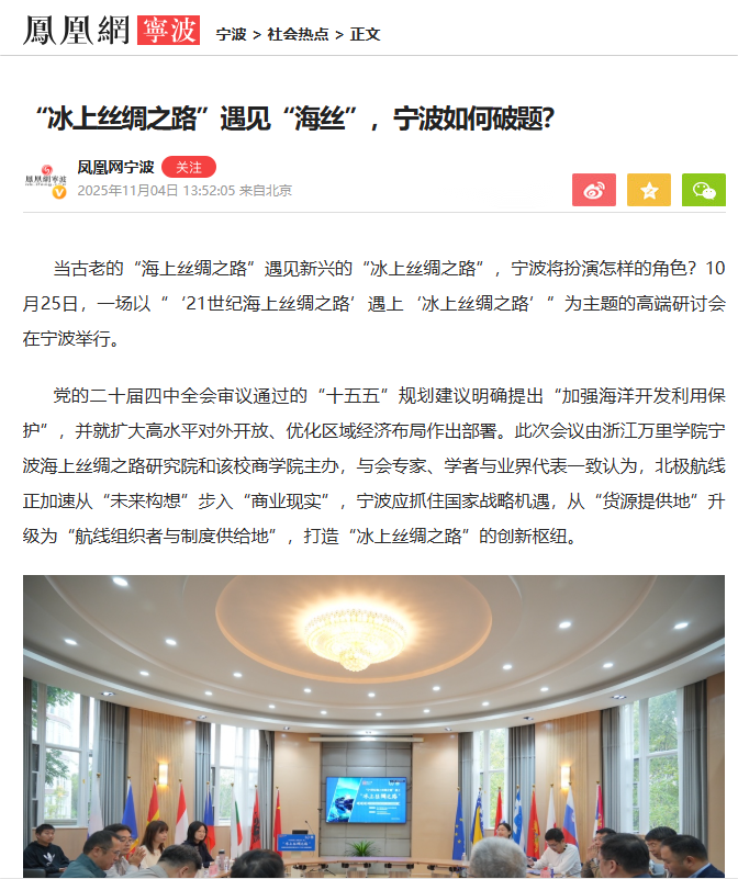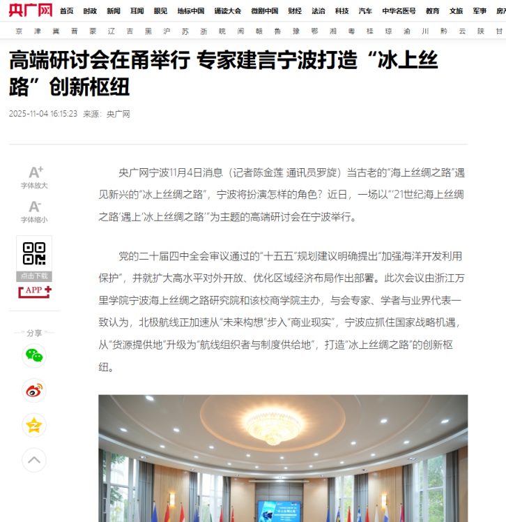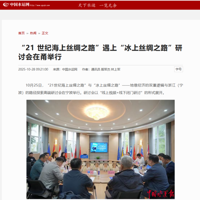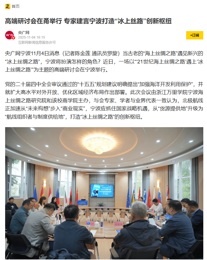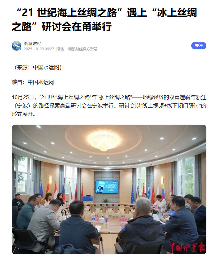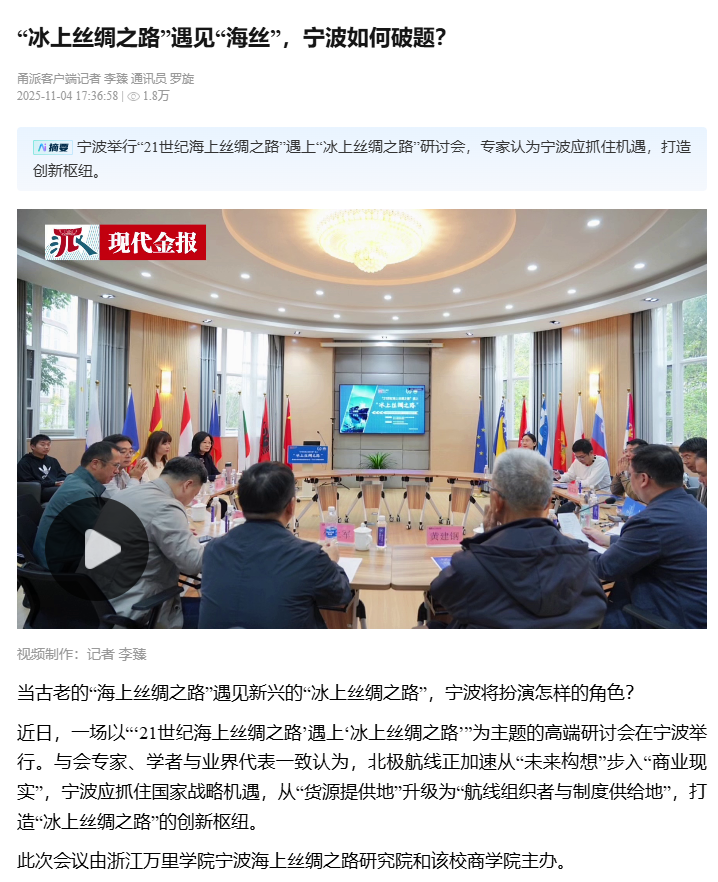 本次研讨会不仅是国内学界深入探讨“21世纪海上丝绸之路”与“冰上丝绸之路”对接的重要实践,也是宁波海上丝绸之路研究院服务国家重大战略、推动区域高质量发展的一次主动作为。来自政府部门、科研院所、航运企业等多领域的专家对话,为两大倡议的协同发展提供了坚实的理论支撑与实践路径。主流媒体从战略意义、合作机遇、实施挑战及未来方向等维度,对本次研讨会的成果进行了全方位报道。