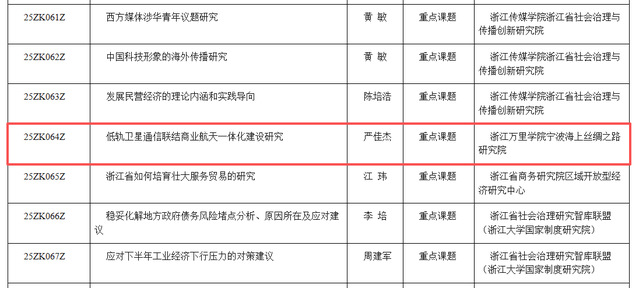 12月22日,浙江省哲学社会科学工作办公室公布了2025年度第一批浙江省新型智库课题名单的通知,浙江省新型智库培育单位—浙江万里学院宁波海上丝绸之路研究院严佳杰老师的《低轨卫星通信联结商业航天一体化建设研究》获批重点课题立项。