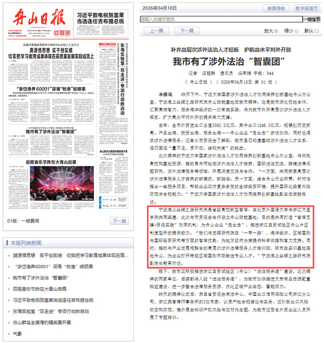 当前,舟山正加快推进海洋经济高质量发展和浙江自贸试验区舟山片区建设,对涉外法治、国际经贸规则、企业合规服务和区域国别研究等高端智力支撑提出了更高要求。2025年,舟山市外贸进出口总值达3562.2亿元,其中出口1246.3亿元,规模创历史新高。伴随产品出海、投资出海、服务出海步伐加快,企业对国际规则解读、贸易风险防范、知识产权保护、原产地合规、出口信用风险管理等专业服务需求日益迫切。